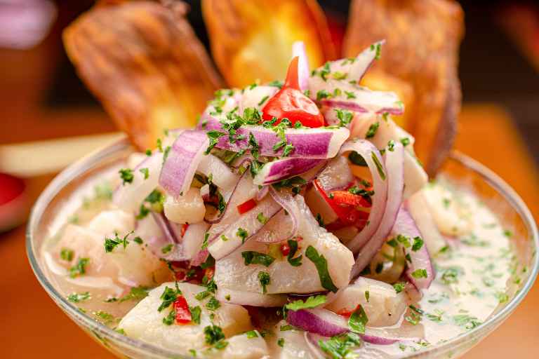 - Ceviche: pescado fresco marinado en jugo de limón.